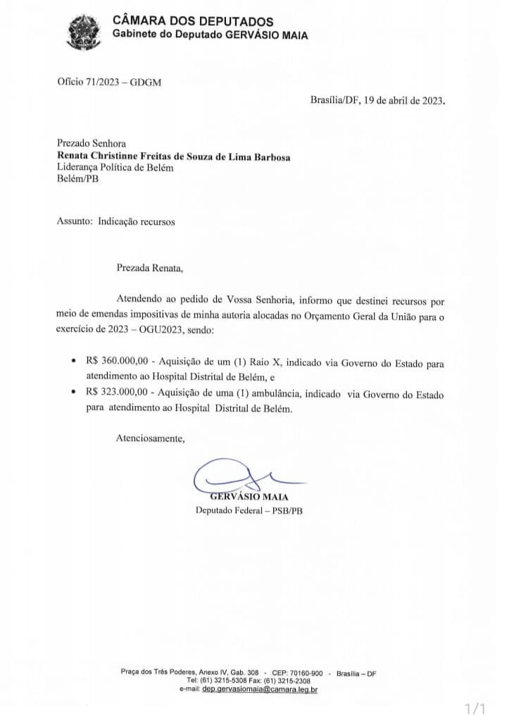 O deputado federal Gervásio Maia (PSB) destinou R$ 683.000,00 (seiscentos e oitenta e três mil reais) em recursos para aquisição de um aparelho raio-x e uma ambulância para servir ao Hospital Distrital da cidade de Belém, no Agreste paraibano.