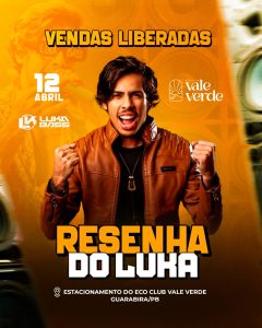 O Eco Clube Vale Verde será palco de uma das festas mais aguardadas do momento: a Resenha do Luka, que acontece no próximo dia 12 de abril, a partir das 15h, no seu estacionamento. O evento vem ganhando destaque em várias cidades do Nordeste e chega ao Brejo embalado pelo sucesso do cantor, que se tornou um dos grandes fenômenos do último Carnaval com o projeto “Playboy de Verão”.