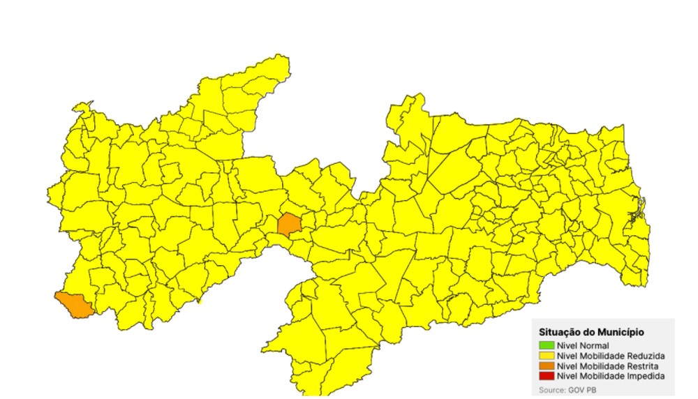A Paraíba tem 221 municípios na bandeira amarela e duas cidades na bandeira laranja, Cacimba de Areia e Santa Inês, de acordo com a 32ª avaliação do Plano Novo Normal a (PNN-PB), divulgada neste sábado (21). O balanço entra em vigor nos 223 municípios do Estado a partir desta segunda-feira (23).